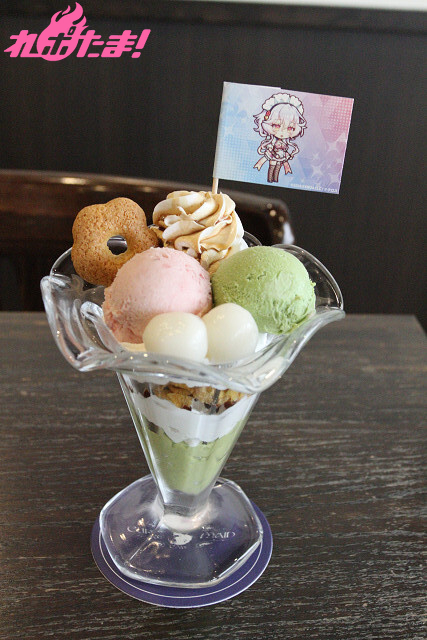 コタロウのガチャイラストにあるパフェをイメージ! 手裏剣のようなそば粉菓子は衣装の花柄にも合わせて。