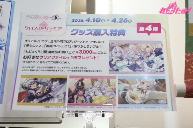 キュアメイドカフェ店内や同フロア「ジーストア・アキバ」にて『テクロノス』『神姫PROJECT』『あやかしランブル!』『れじぇくろ!』関連商品お買い上げ3,000円(税込)ごとにお好きな1枚プレゼント!!コラボカフェと合わせてご利用ください。