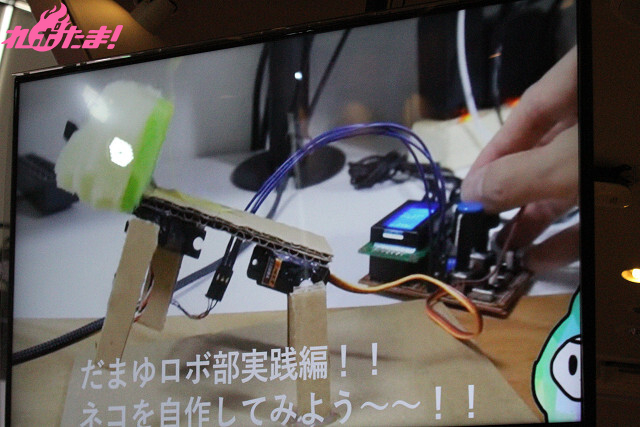 最後は峯田さんと石川さんがロボットを制作する「だまゆロボ部実践編~!! ネコを自作してみよう~!!」コーナー。今回は3Dプリンターで作られた、「ねこじゃらしとじゃれつくネコ」の組み立てに挑戦!