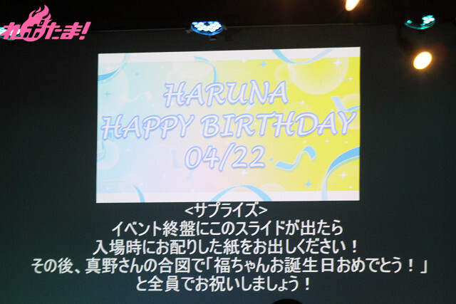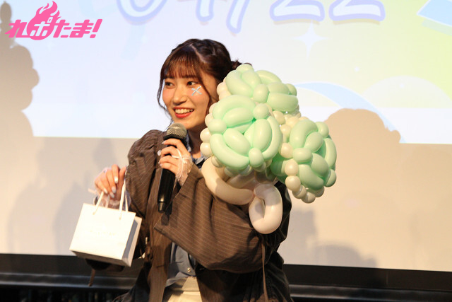この日のために制作されたグッズの1つ「バースデーフォトブック」の写真撮影の模様を収めたメイキング映像を紹介……しようとした矢先、バルーンアートの花束を手にした真野さんがステージに登場し、驚きを隠せない様子の福嶋さん。