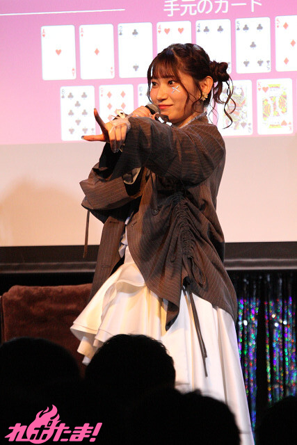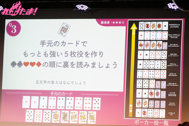 なお、出題される問題は、こちらも福嶋さんが大好きな「ポーカー」を絡めたもの。ステージ上に用意されたトランプにヒントが隠されており、どうしても解けない場合は真野さんに手持ちのチョコレートを渡すことによって、制限時間の延長、およびヒントが与えられる。